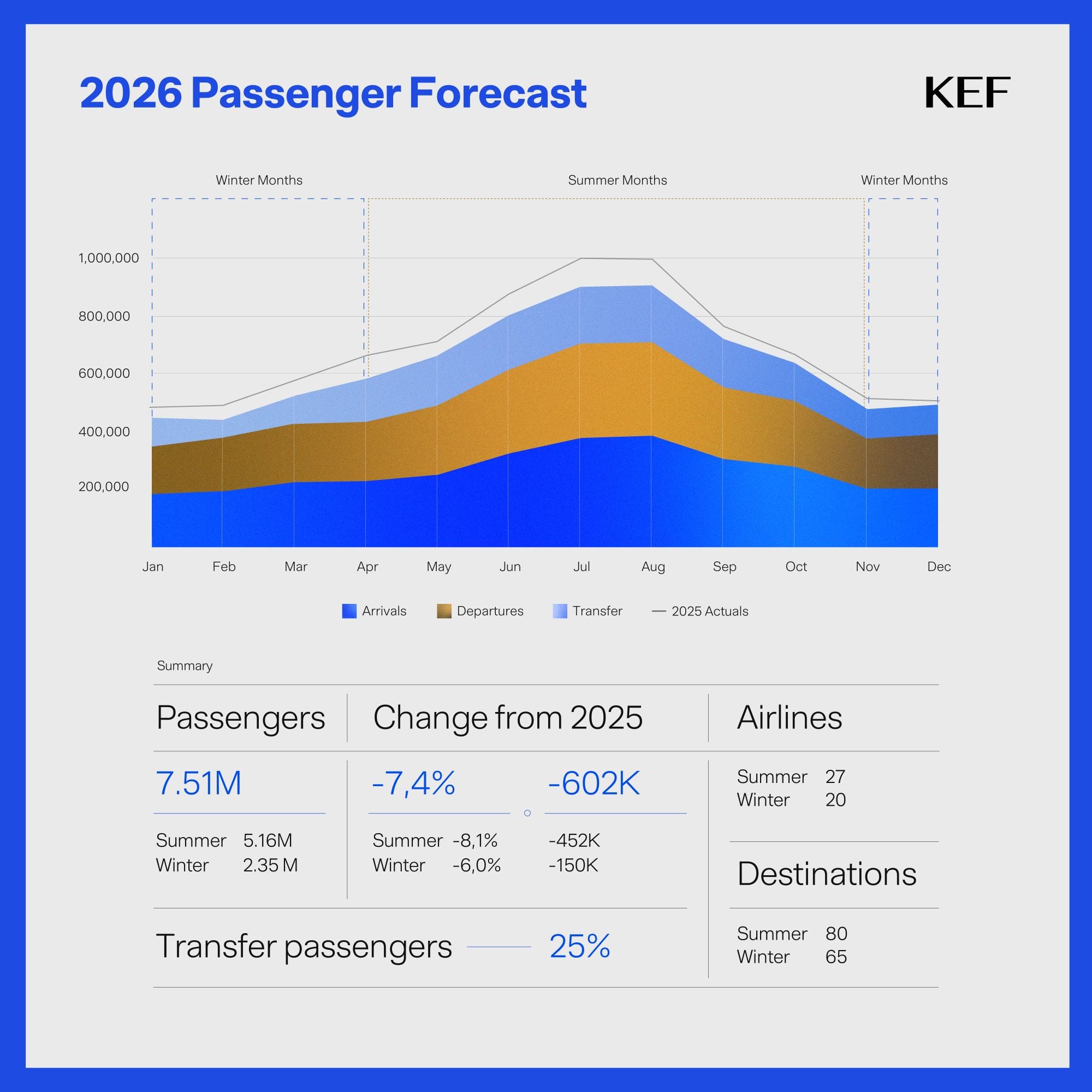 The 2026 KEF Passenger Forecast is based on an analysis of factors influencing passenger demand for flights to and from the airport. The forecast relies on data about handling times secured by airlines, information from KEF Airport's systems, and updates on airline plans.